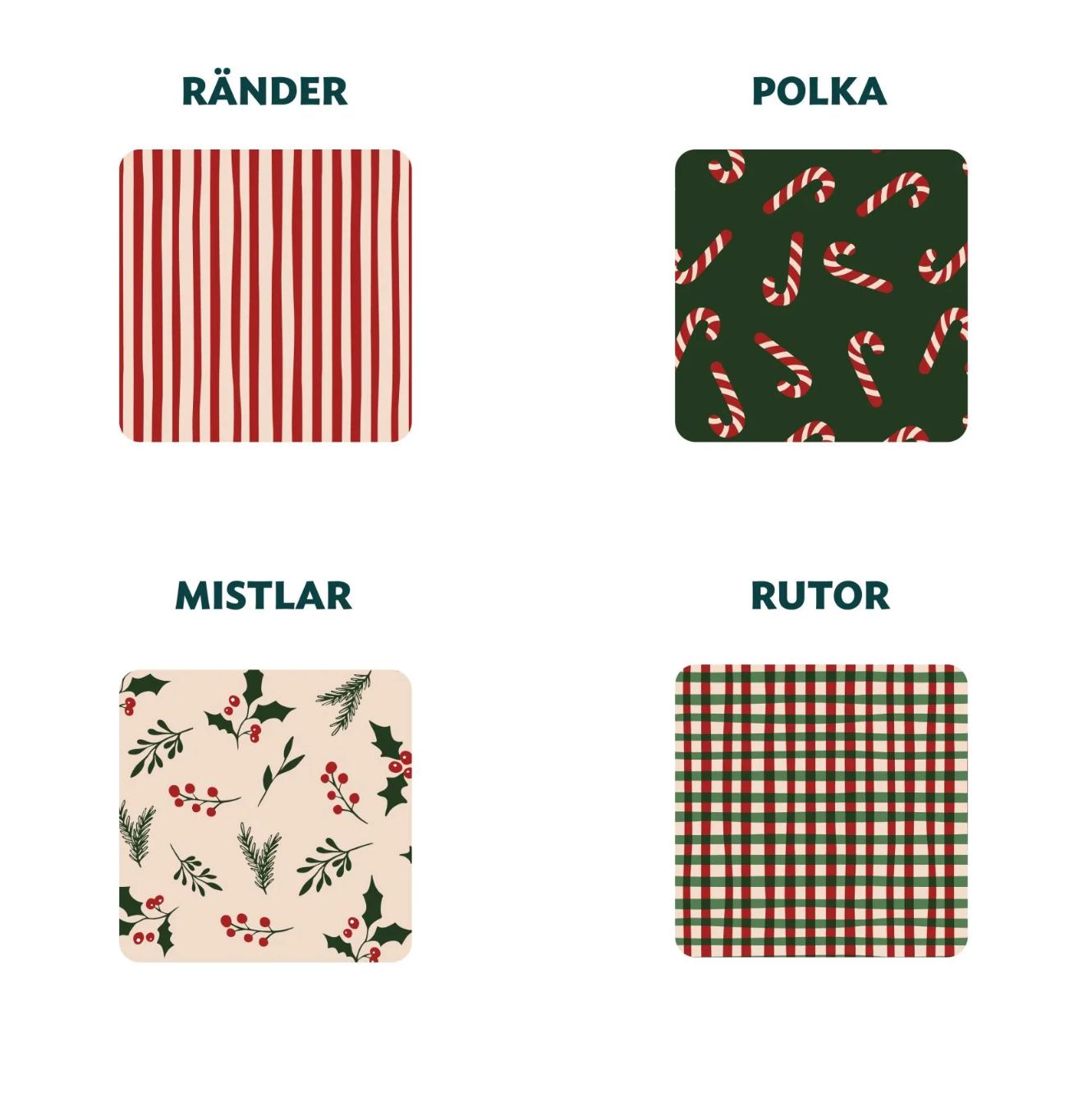 Förpackningen kan tryckas med din logotyp, julhälsning eller illustration i fullfärg. Välj mellan våra färdiga julmotiv – Mistlar, Rutor, Ränder eller Polka – eller skapa en helt egen banderoll i unik design. Resultatet blir en profilprodukt som både smakar gott och stärker din företagsidentitet.