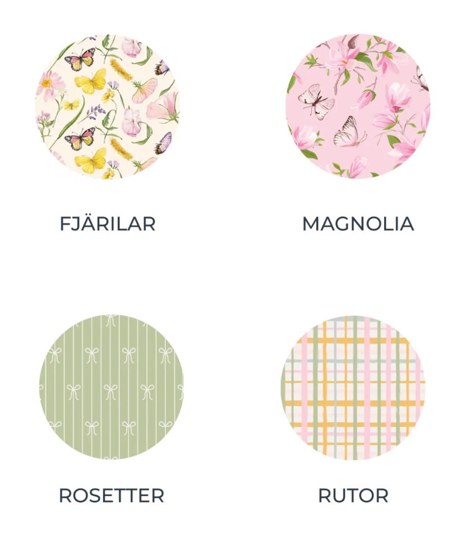 • Färger: fjärilar, magnolia, rosetter, rutor