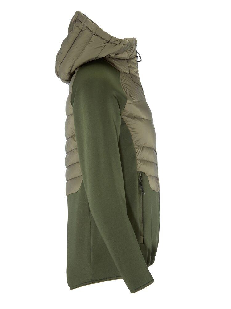 Denna jacka med tryck kombinerar tunn 90/10-dunisolering över överkropp och huva med mjuk, borstad power-fleece i ärmar, sidor och nederkant. Konstruktionen ger effektiv värme runt kroppens kärna samtidigt som fukttransport och flexibilitet prioriteras. För företag som söker jackor med tryck för aktiva arbetsmiljöer eller rörliga sammanhang är detta ett tekniskt balanserat alternativ inom moderna företagskläder.