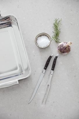 Kniven och gaffeln är tillverkade i rostfritt högkvalitativt stål för bästa skärpa och hållbarhet. Handtagen i svart pakkaträ ger både ett exklusivt uttryck och en bekväm känsla i handen. Kombinationen av robust stål och vackert trä skapar ett set som både är funktionellt och dekorativt.