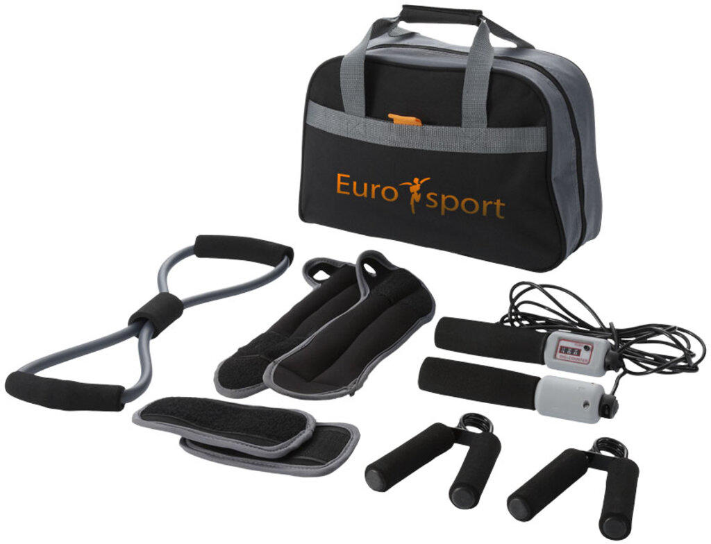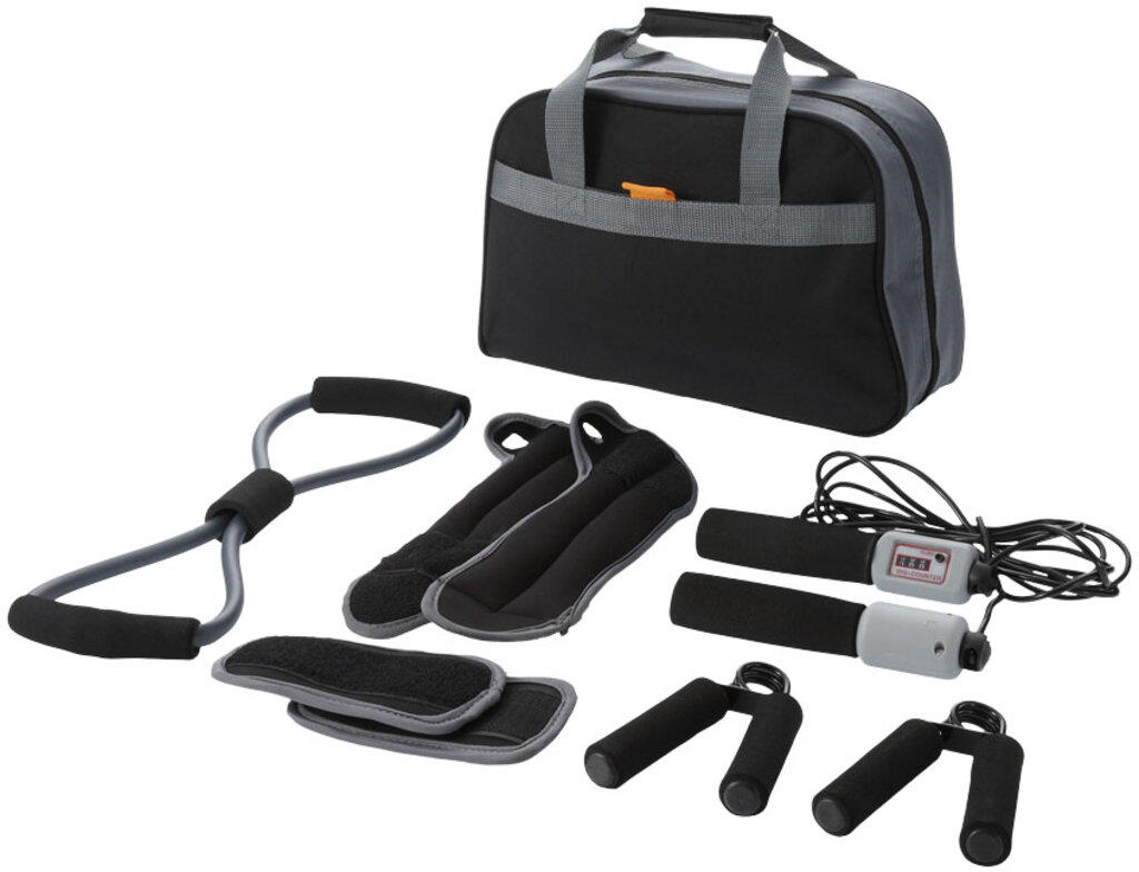9-delars väska med blixtlås och ficka fram som innehåller handstärkare, ankelvikter, vanliga vikter, träningsband och hopprep med räknare.