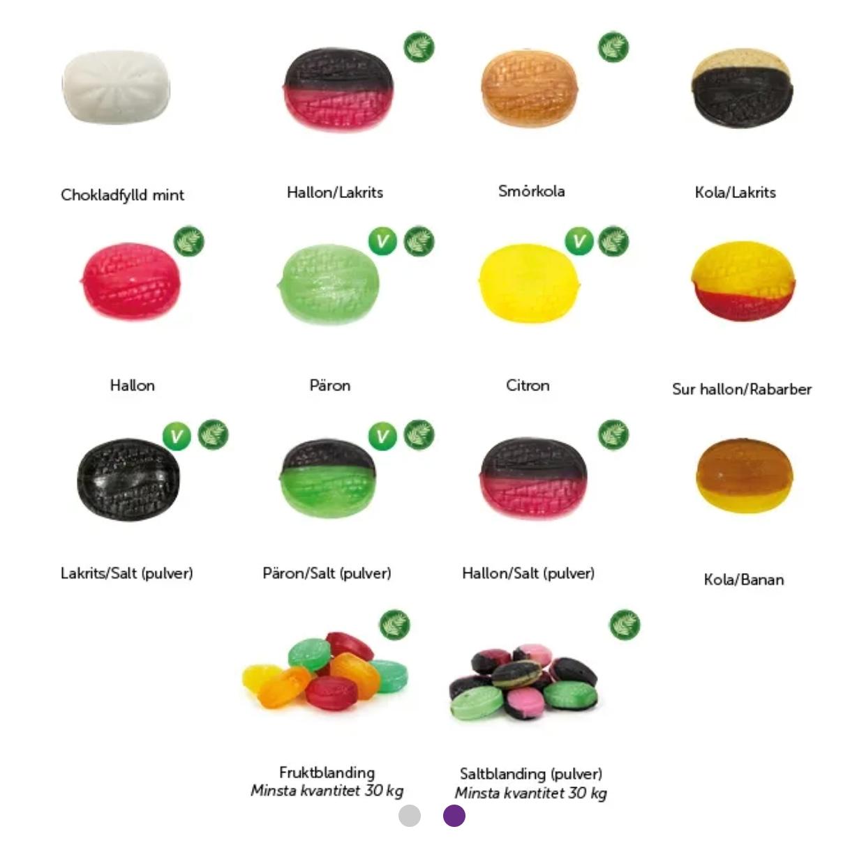 De svenskproducerade karamellerna tillverkas med svenskt socker och levereras färskt med ca 18 månaders hållbarhet. Du kan välja mellan en mängd olika smaker, bland annat hallon, päron, citron, smörkola, hallon/lakrits, sur hallon/rabarber, kola/lakrits och chokladfylld mint. För dig som vill ha fler smaker erbjuder vi även fruktblandning och saltblandning med pulver. Det finns även nyheter i sortimentet, såsom kolablandning med banan samt rabarbervariationer.