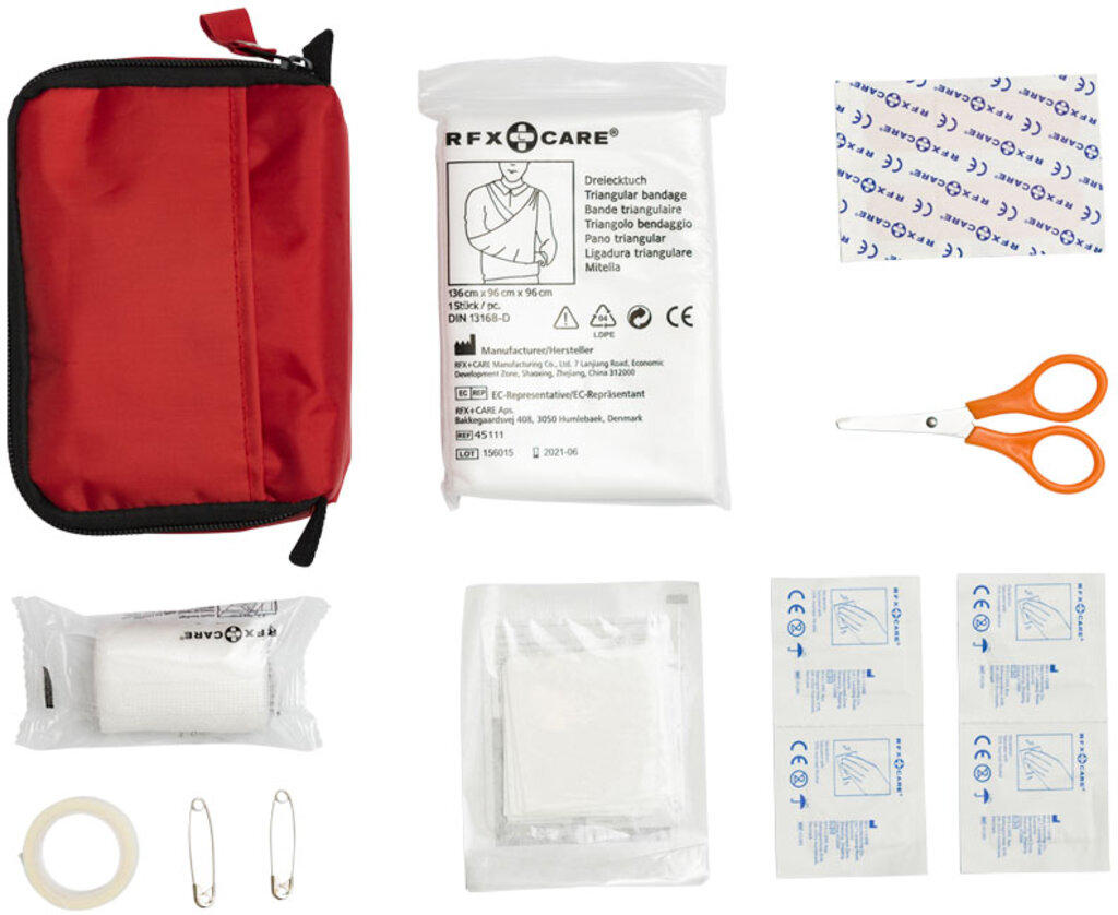 19 delars första hjälpen kit. 5 plåster, 4 våtservetter, bandage, triangelbandage, 2 säkerhetsnålar, 5 gasbindor och sax i en nylonväska. Godkänd enligt EN13485. 70D nylon.