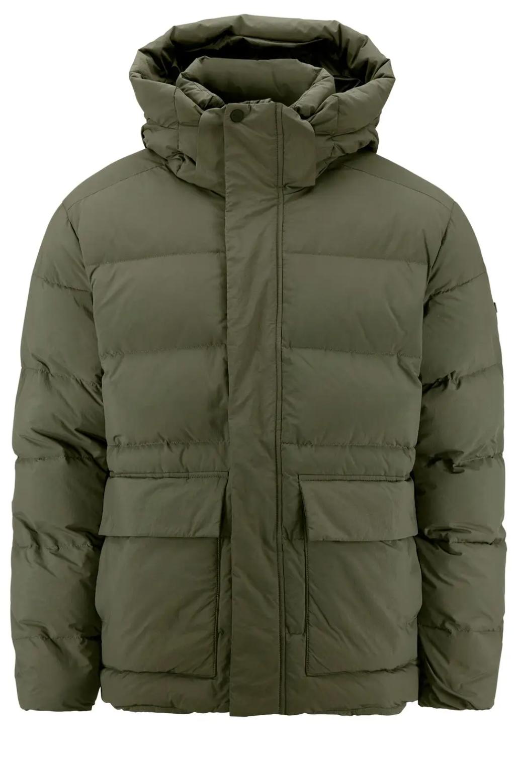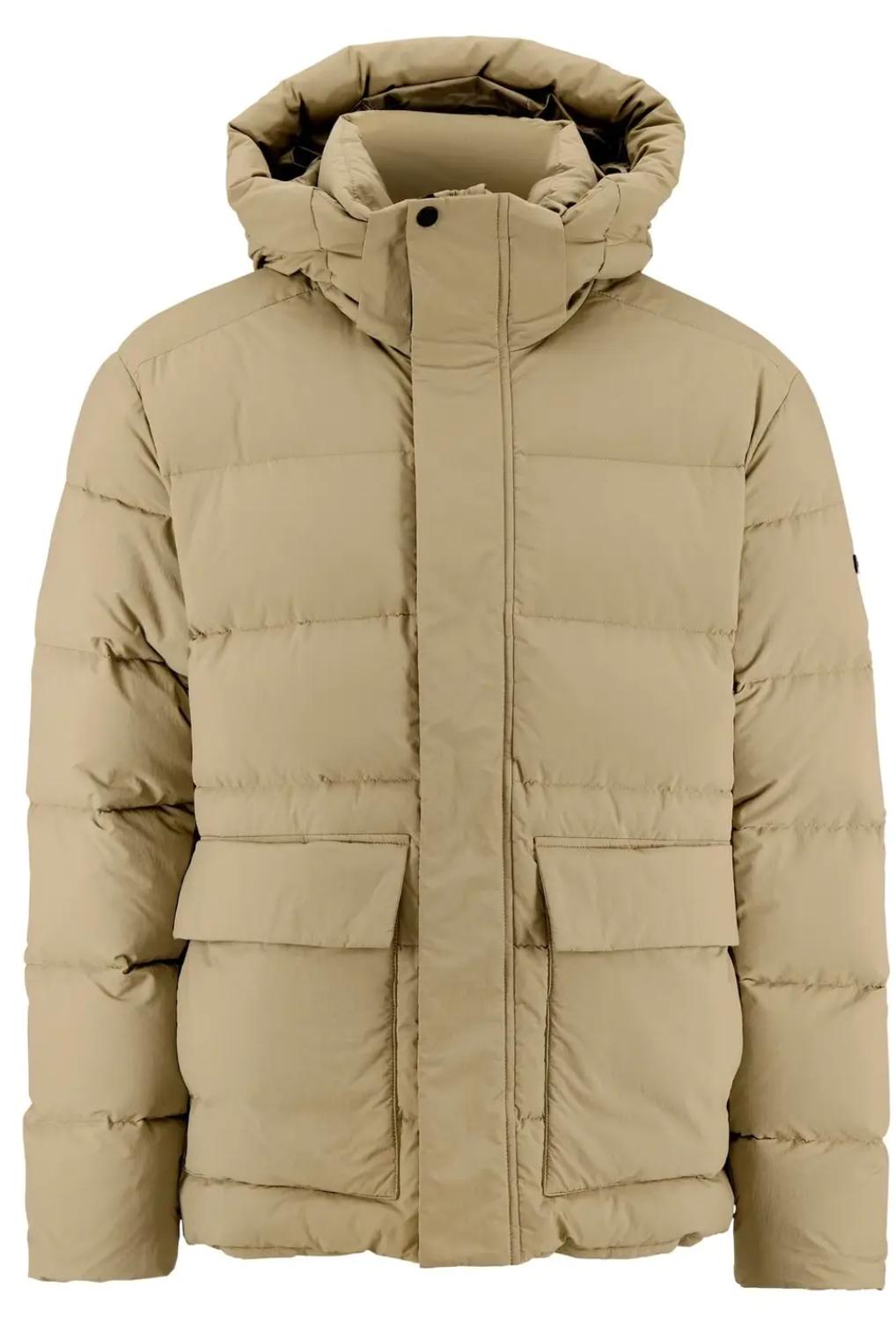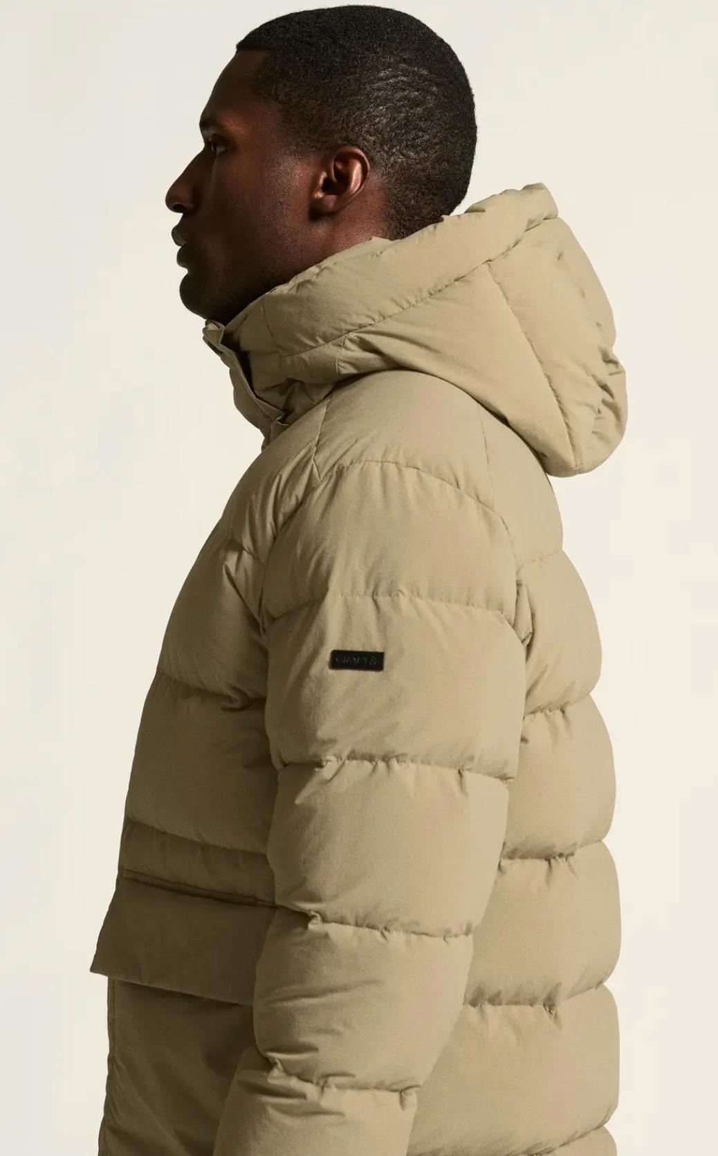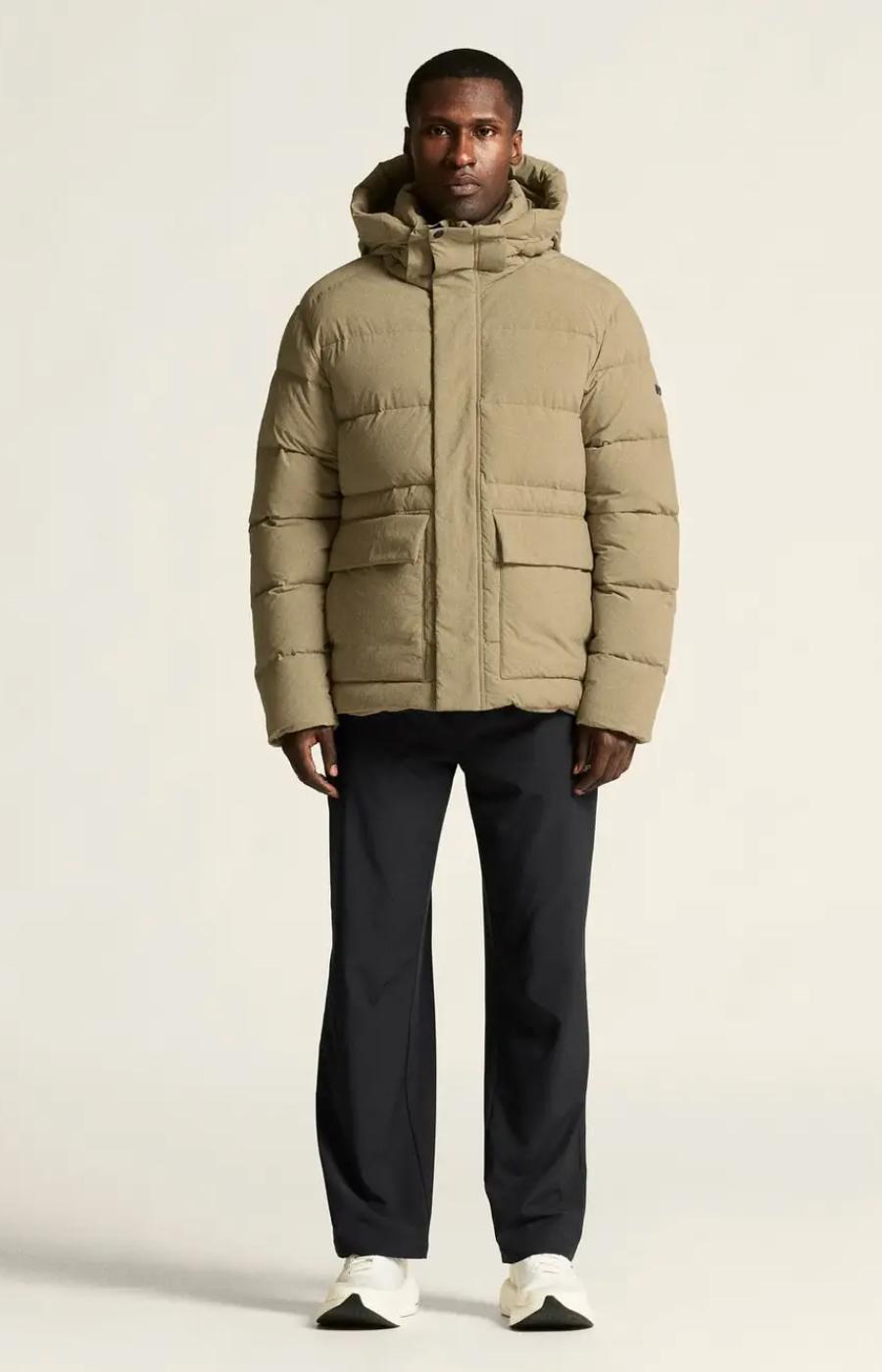 • Yttertyg av 100% återvunnen polyamid • Vattenavvisande impregnering • Dunfoder, 80 dun/20 fjädrar • Avtagbar huva • Justerbar dragsko nedtill • Innerficka • Två värmande handfickor • YKK-dragkedja • Regular fit