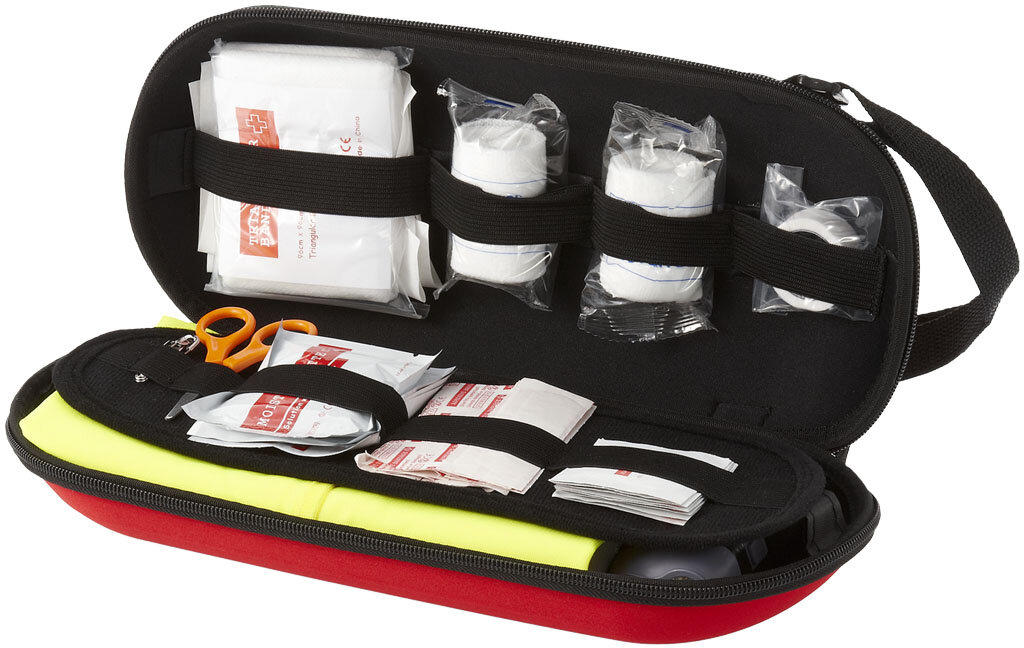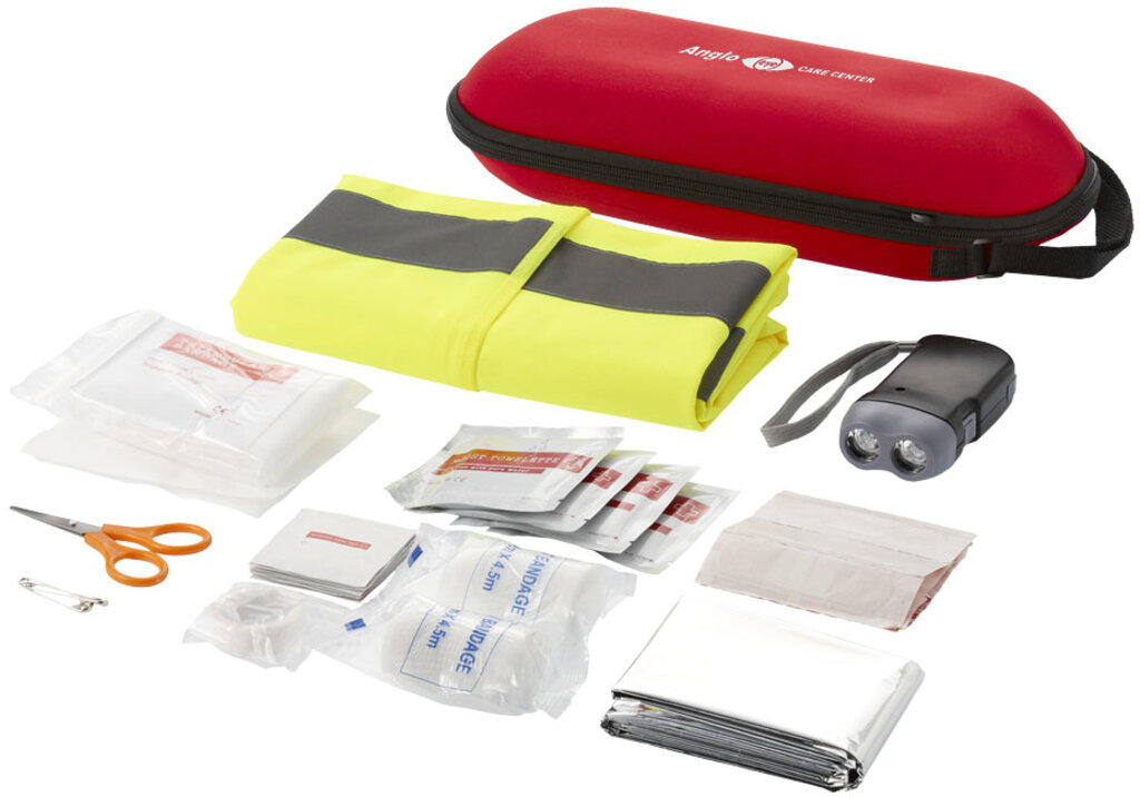Första hjälpen-set i 46 delar och professionell säkerhetsväst. Praktiskt första hjälpen-set för bilen med ett triangelbandage, sax, 2 nålar, 2 förband, 1 kirurgtejp, 15 plåster, 8 spritkompresser, 2 våtservetter, 2 rengöringsservetter, 10 gasbindor, en säkerhetsväst godkänd för professionellt bruk, en första hjälpen-filt och en dynamoficklampa. Överensstämmer med ISO EN 20471 och EN13485. EVA påse.